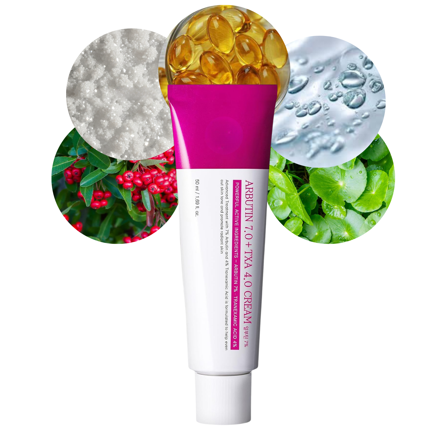 Arbutin (7%) acts as a controlled-release tyrosinase inhibitor, moderating excess melanin synthesis at the source, while Tranexamic Acid (4%) targets the plasminogen–plasmin pathway, reducing UV- and inflammation-induced discoloration, melasma, and post-acne marks.